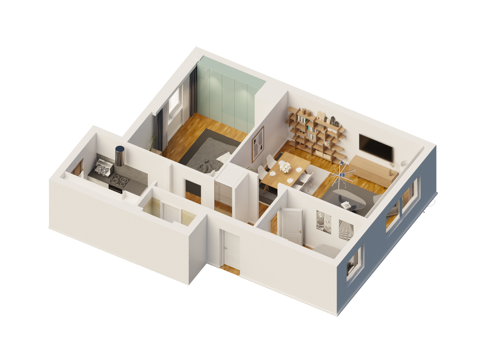 Innenräume: 1x Wohnzimmer, 1x Küche, 2x Schlafzimmer, 1x Badezimmer